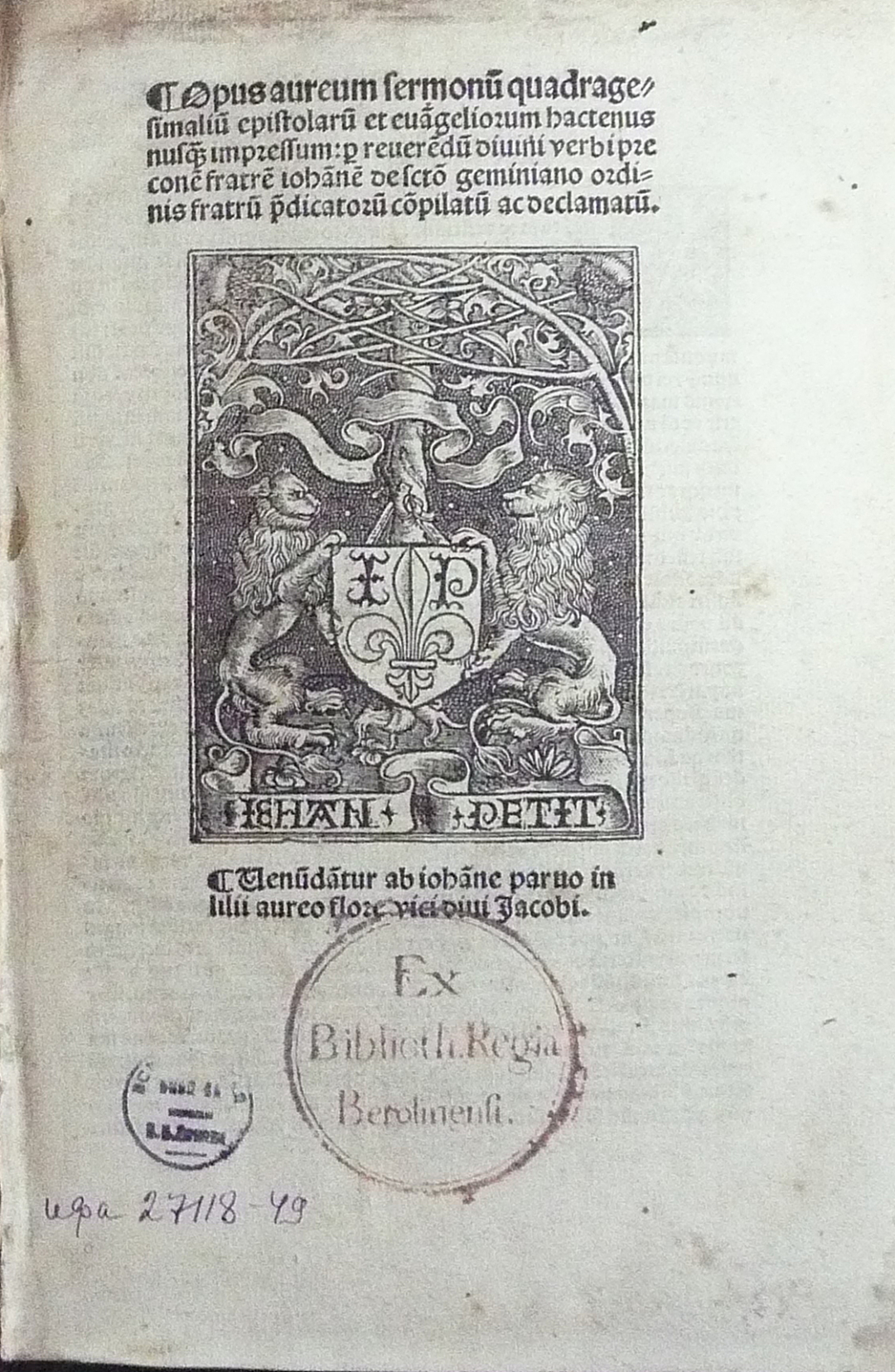 Opus aureum sermonum quadragesimalium epistolarum et evangeliorum : hactenus nusquam impressum / per ... fratrem Johannem de sancto Geminiano ... compilatum ac declamatum. — Paris: Jean Petit, 1511. — [192] л.: ил.; 4°