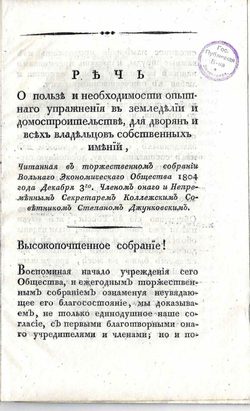 Речь о пользе и необходимости опытнаго упражнения в земледелии и домостроительстве, для дворян и всех владельцов собственных имений, / читанная в торжественном собрании Вольнаго экономическаго общества 1804 года декабря 3го. членом онаго и непременным секретарем коллежским советником Степаном Джунковским. — [Санкт-Петербург]: [типография И. Глазунова], [1805]. — 23, [1] с.; 8°