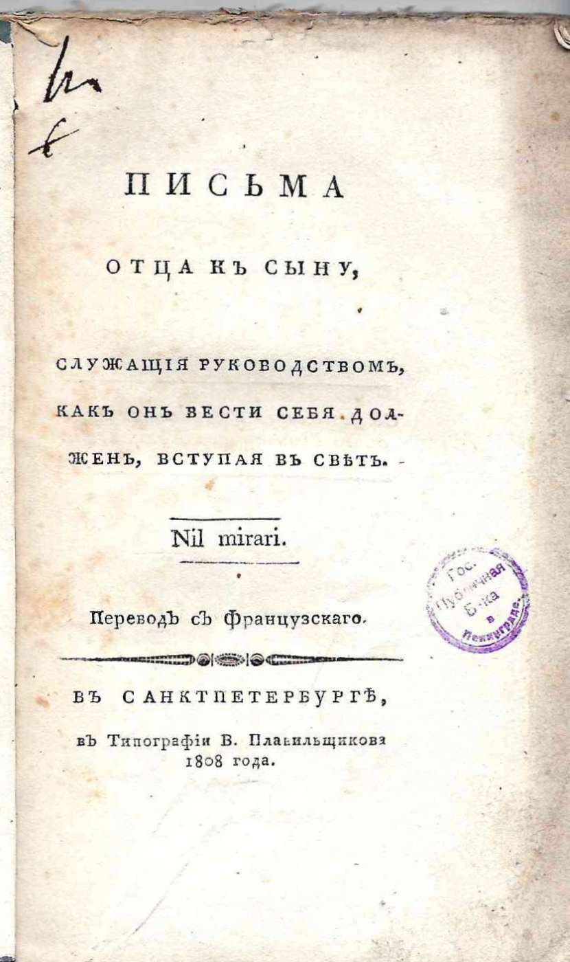 Письма отца к сыну, служащия руководством, как он вести себя должен, вступая в свет.: Перевод с французскаго. — В Санктпетербурге: в типографии В. Плавильщикова, 1808. — [8], 49, [1] с.; 12°