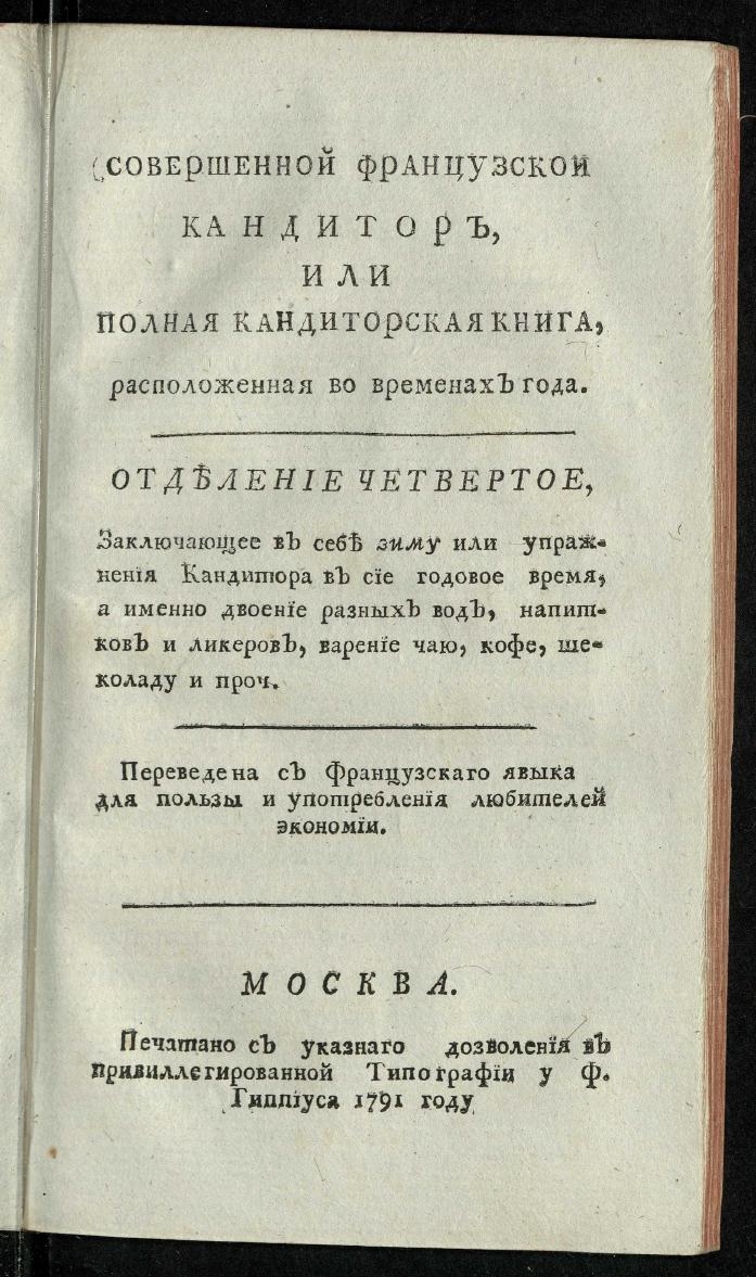 [Ч. 7] : Отделение 4-е, заключающее в себе зиму или упражнения кандитора в сие годовое время, а именно двоение разных вод, напитков и ликеров, варение чаю, кофе, шеколаду и проч. — , 1791. — 108, [4] с. ; 8°