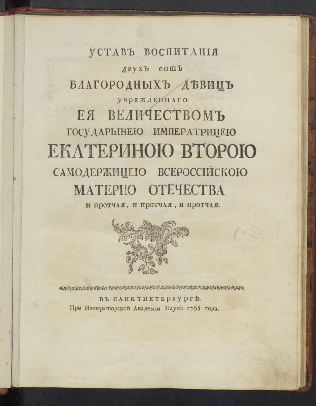 Устав воспитания двух сот благородных девиц учрежденнаго ея величеством государынею императрицею Екатериною Второю самодержецею всероссийскою материю Отечества и протчая, и протчая, и протчая.: [Конфирмован Маия 5 дня 1764 года в Сарском селе]. — В Санктпетербурге: при Императорской Академии наук, [1769]. — 68, [10], 54, [6] с., [1] л. ил.: ил.; 4°
