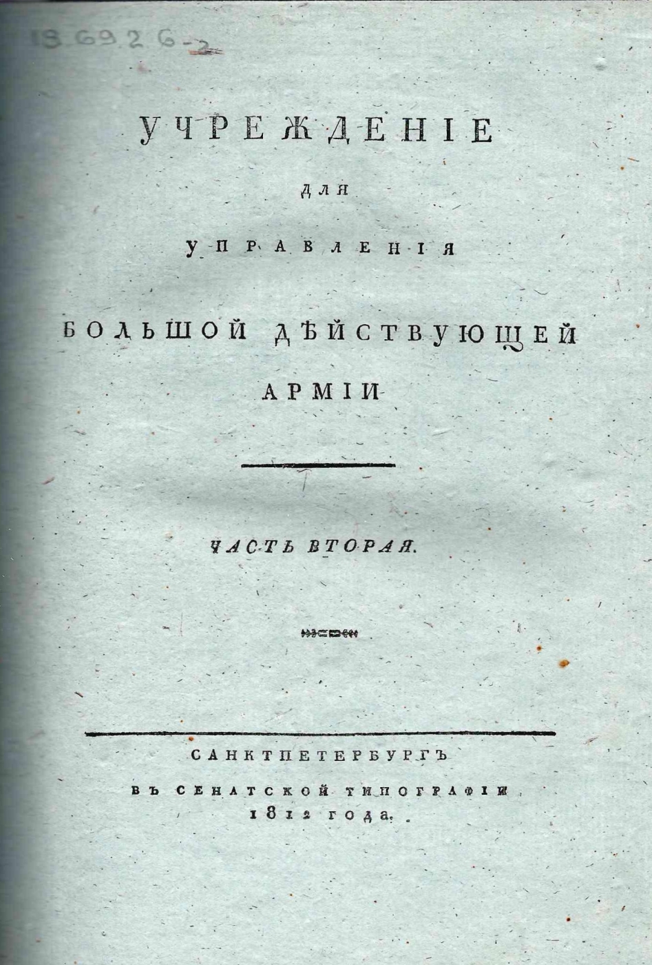 Учреждение для управления Большой действующей армии. — Санктпетербург: в Сенатской типографии, 1812