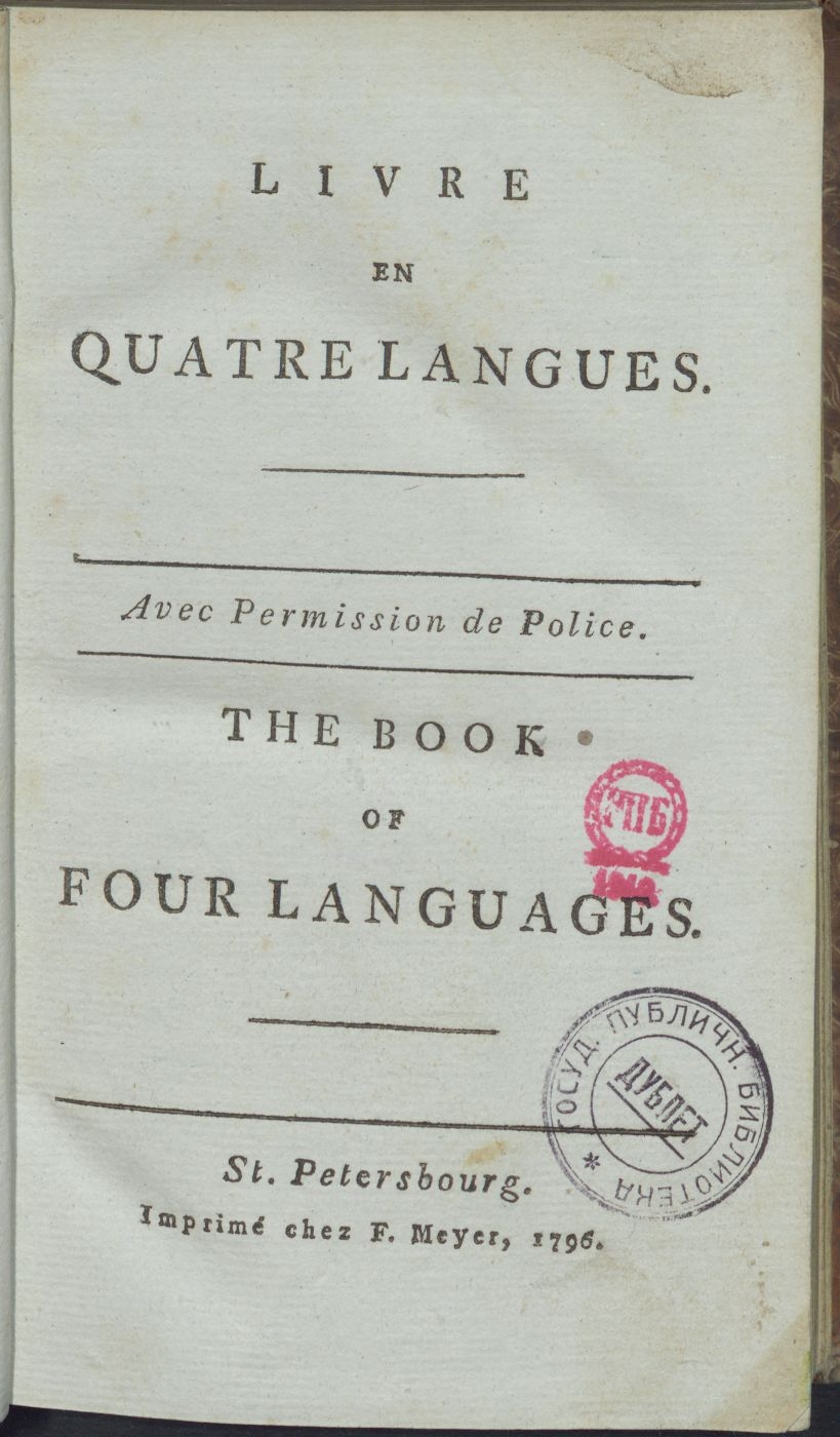 Книга на четырех языках = Das Buch in vier Sprachen. — В Санктпетербурге: печатано в типографии Ф. Мейера, 1796. — [8], 355 с.; 8°