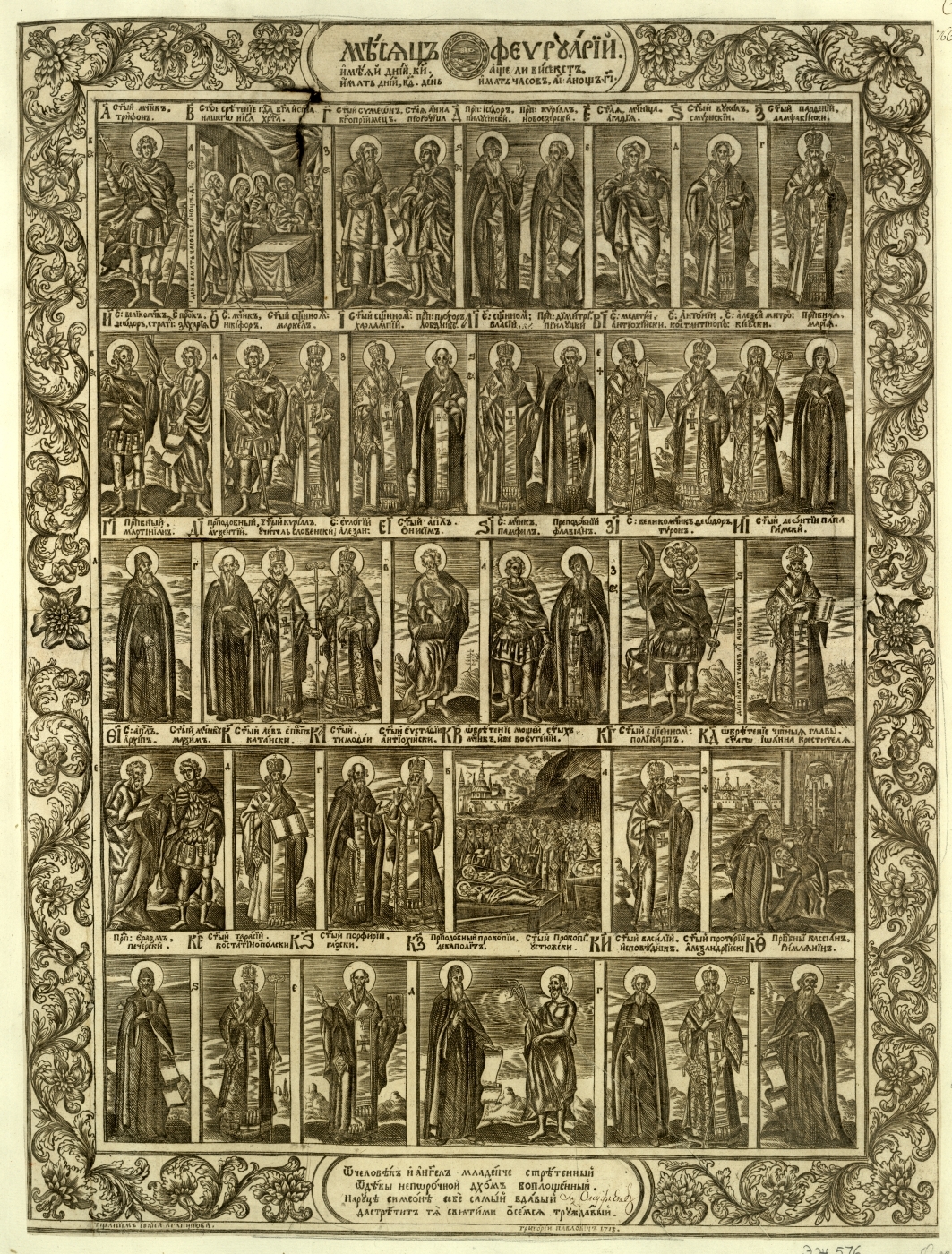 [Святцы, месяц ианнуарий]: [лубок] / гридеровал Григорий Тепчегорский. — [Москва]: [б. и.], 1713. — На 4 склеен. л.; 56,6х43,5 см