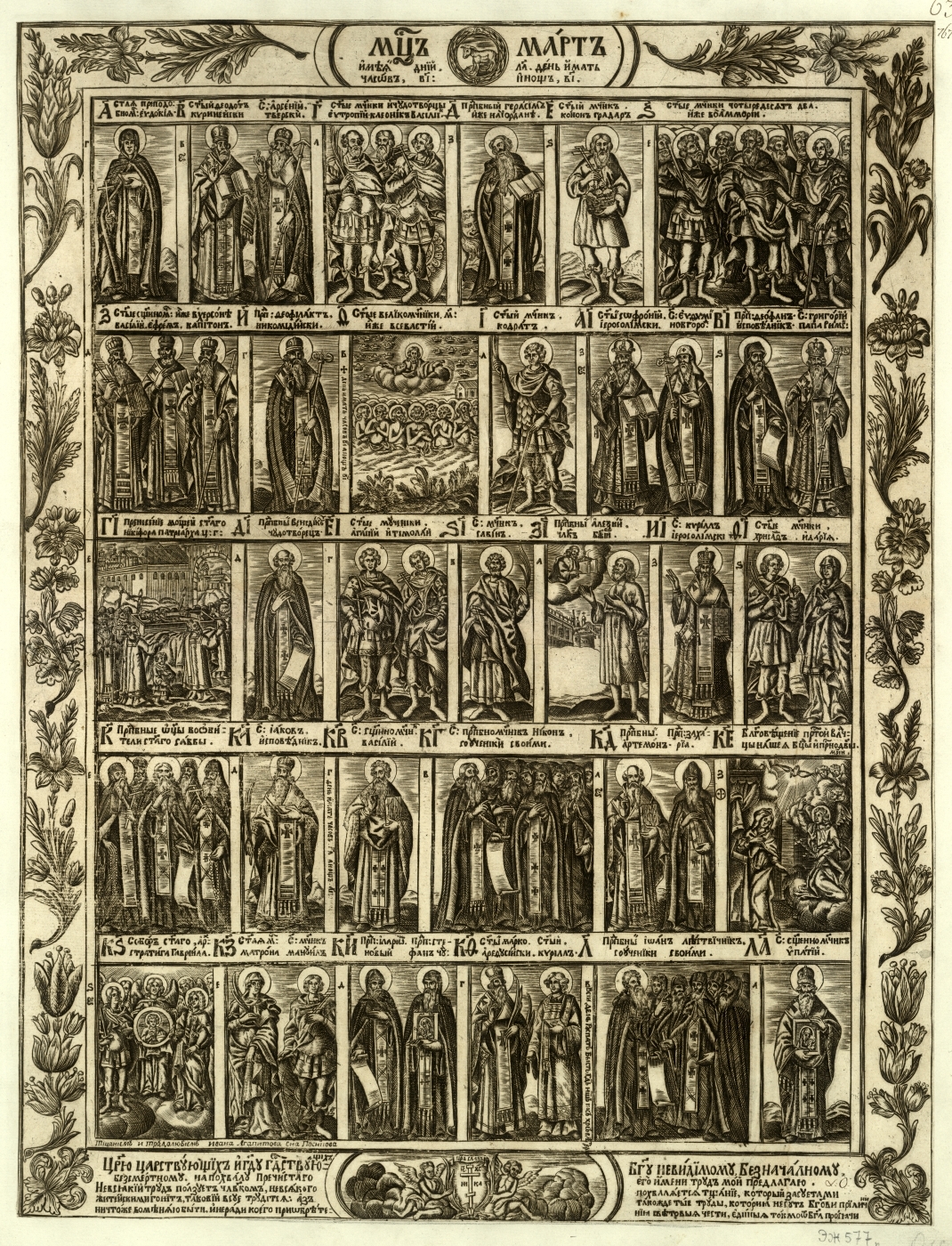 [Святцы, месяц март]: [лубок] / гридеровал Григорий Тепчегорский. — [Москва]: [б. и.], 1713. — На 4 склеен. л.; 56,4х43 см