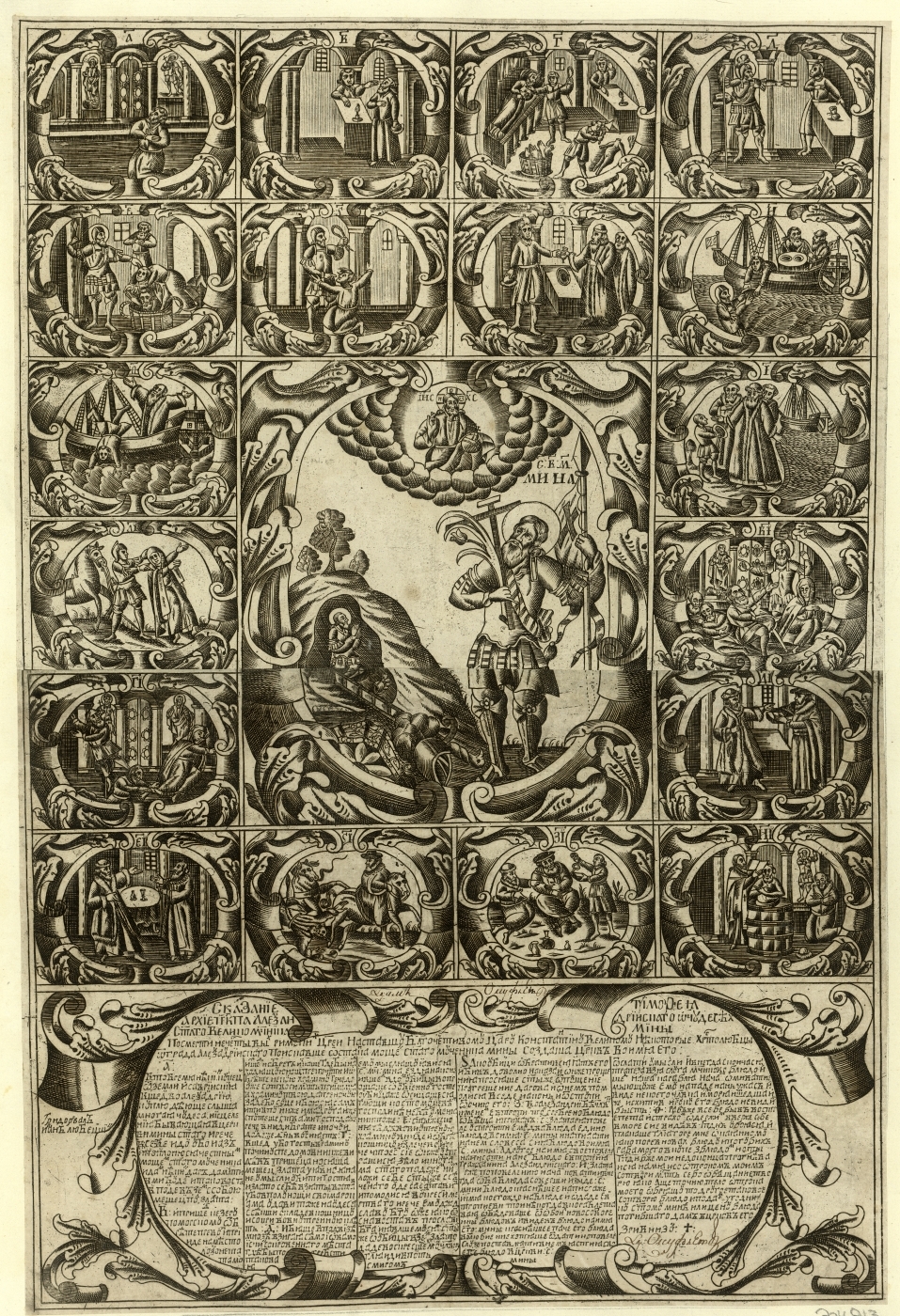 Святой великомученик Мина : [лубок] / Гридоровал Иван Любецкий. — [Москва]: [б. и.], Первая половина XVIII в. — На 2 склеен. л. (19 изобр.); 57,8х35,3 см.