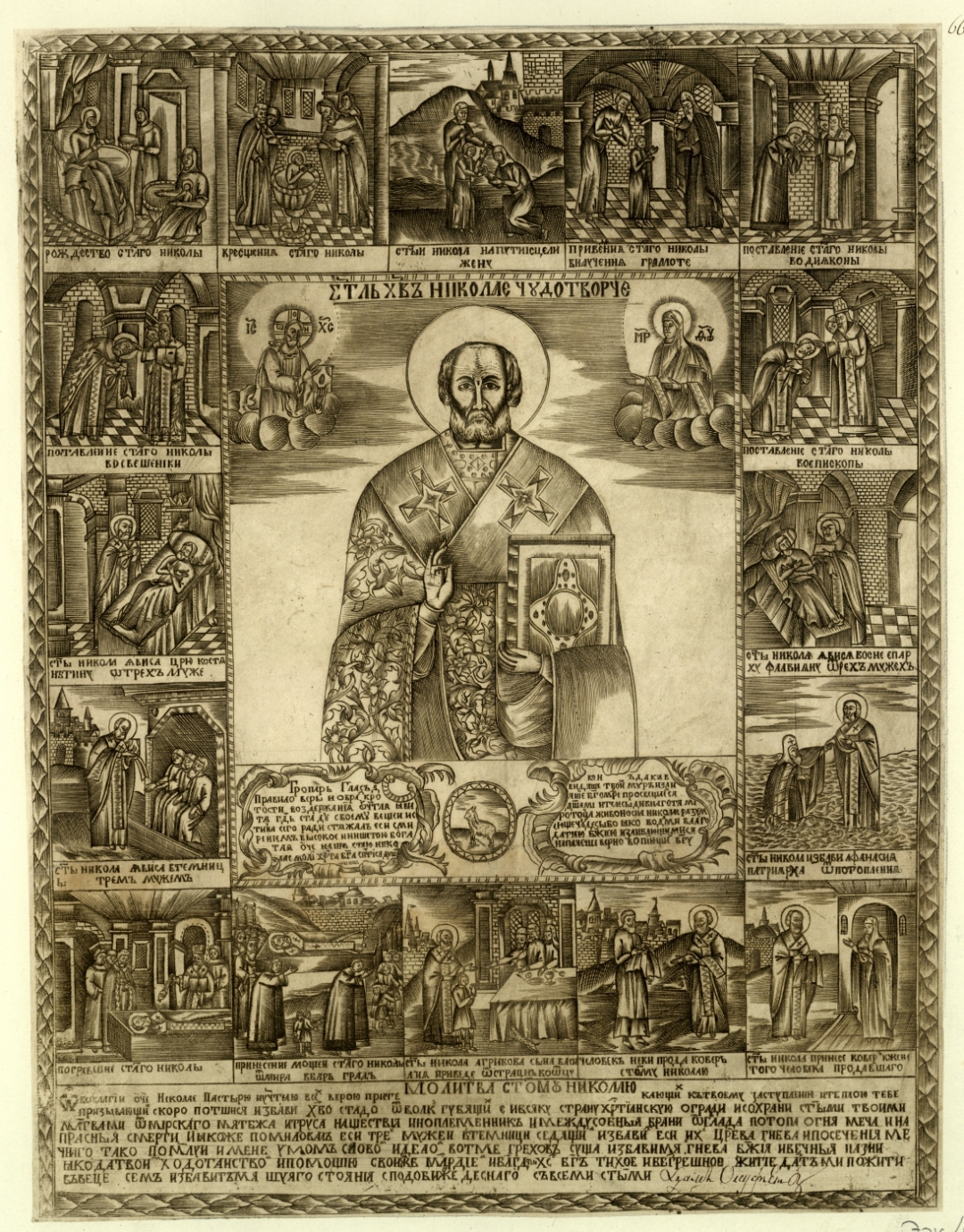 Образ святаго Николая Чюдотворца : [лубок]. — [Москва]: [б. и.], XVIII в. — 1 л. (13 изобр.) ; 37,5х28 см.