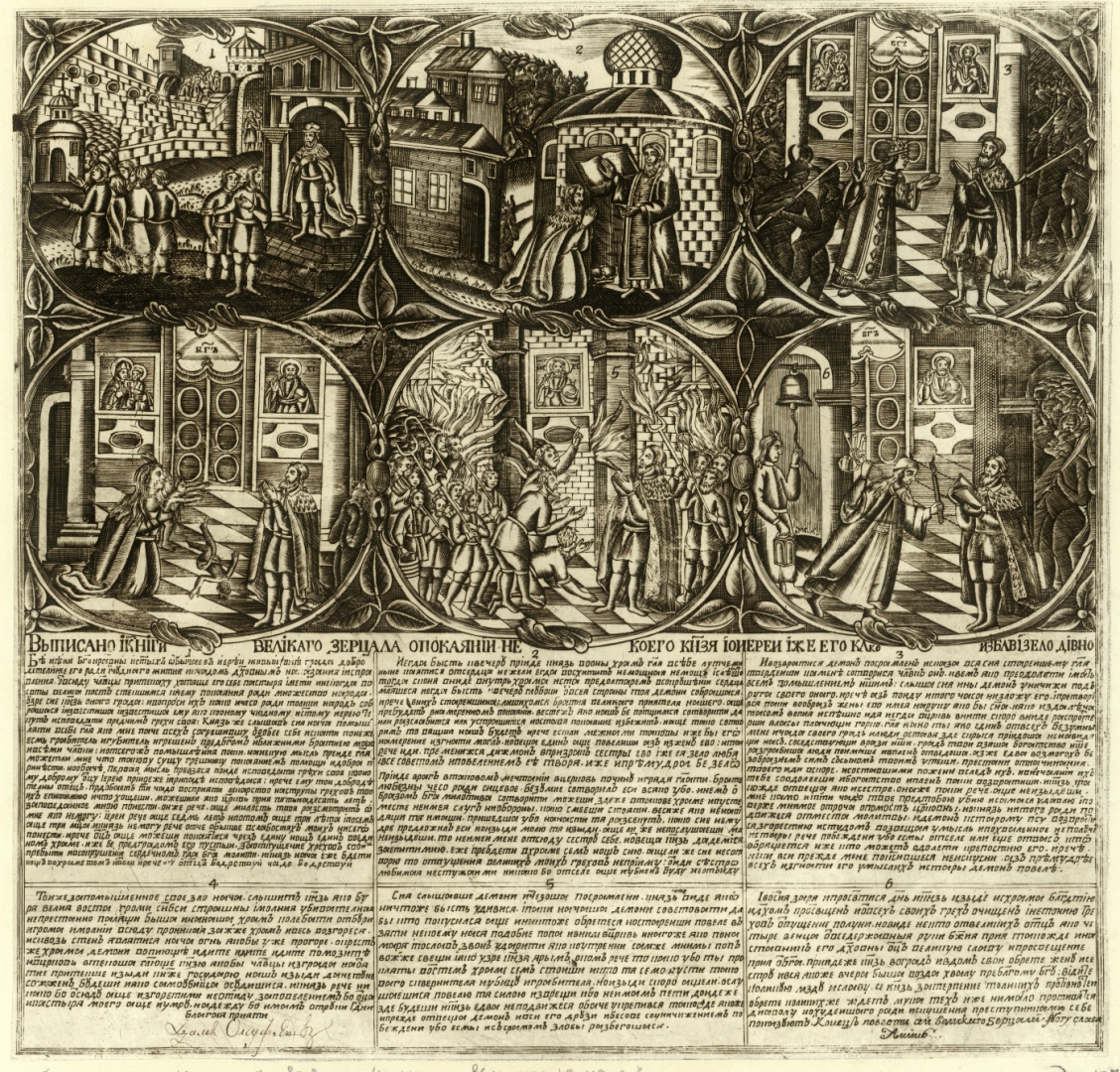 [Притча о покаянии некоего князя] : [лубок]. — [Москва]: [б. и.], Первая половина XVIII в. — 1 л. (6 изобр.) ; 40,5х30,8 см.