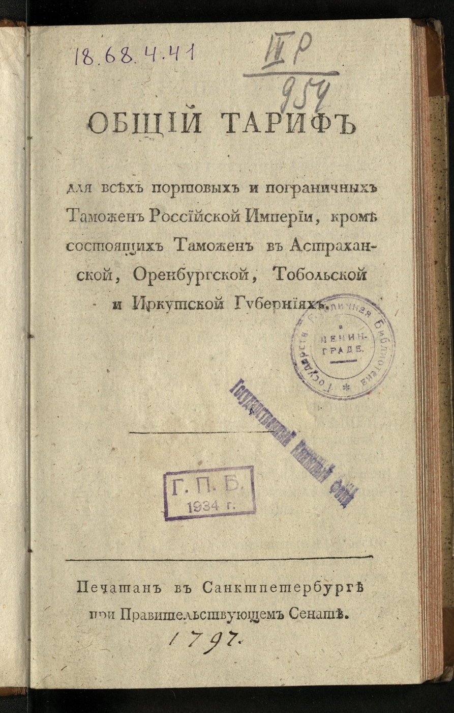 Общий тариф для всех портовых и пограничных таможен Российской империи, кроме состоящих таможен в Астраханской, Оренбургской, Тобольской и Иркутской губерниях.: [Утвержден в Гатчине 14 октября 1797 года]. — Печатан в Санктпетербурге: при Правительствующем Сенате, [1797]