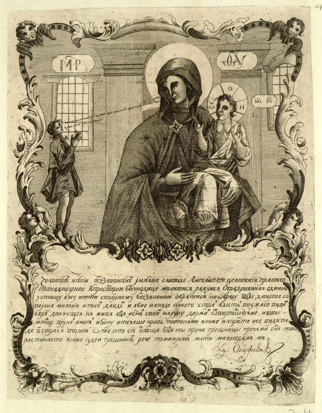 [Образ Пресвятой Богородицы Иверской с чудесами]: [лубок] / грыдоровал вмоскве бывшеи сянкт Петербургскои Типографии гридорованних дел ученик Иоанн Любецкии. — Москва: [б. и.], 1735. — На 3 склеен. л.; 49,5х44,3 см