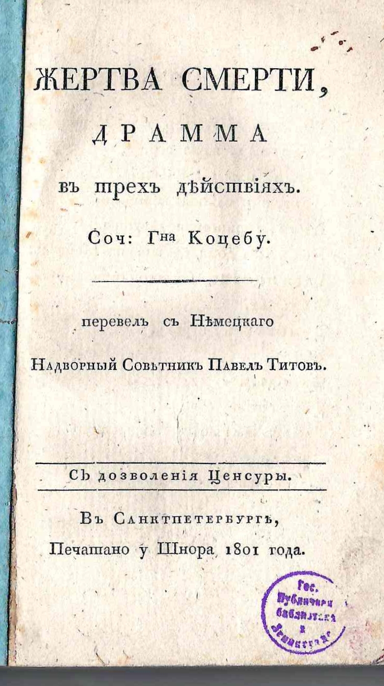 Жертва смерти,: драма в трех действиях. / Соч. гна Коцебу.; Перевел с немецкаго надворный советник Павел Титов. — В Санктпетербурге: печатано у Шнора, 1801. — 132 с.; 12°