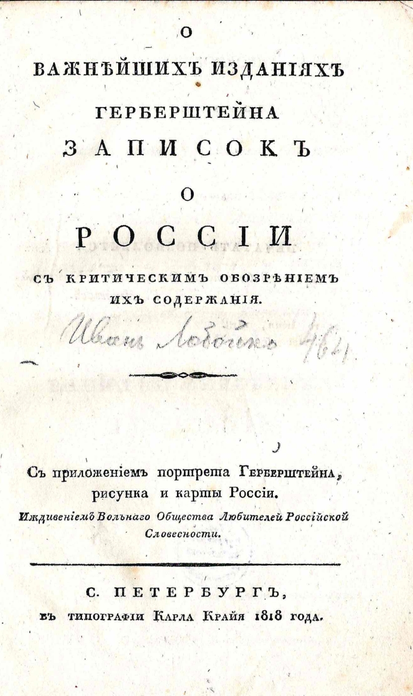 О важнейших изданиях Герберштейна Записок о России: с критическим обозрением их содержания. С приложением портрета Герберштейна, рисунка и карты России. — С.Петербург: иждивением Вольнаго общества любителей российской словесности : в типографии Карла Крайя, 1818. — [6], 39, [1] с., [3] л. портр., карт.; 8°