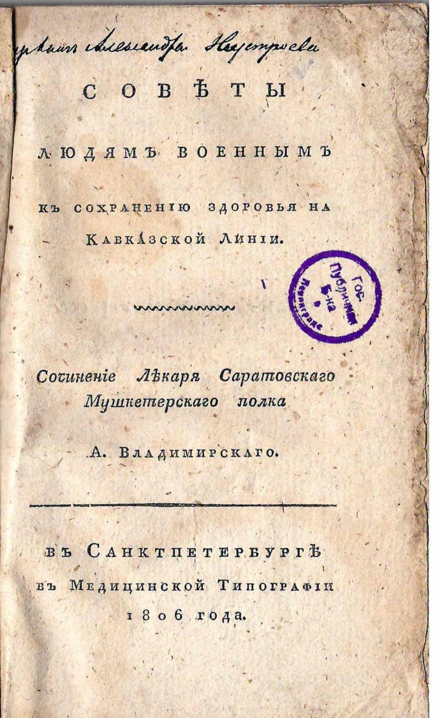 Советы людям военным к сохранению здоровья на Кавказской линии. / Сочинение лекаря Саратовскаго мушкетерского полка А. Владимирскаго. — В Санктпетербурге: в Медицинской типографии, 1806. — 66, [2] с.; 12°