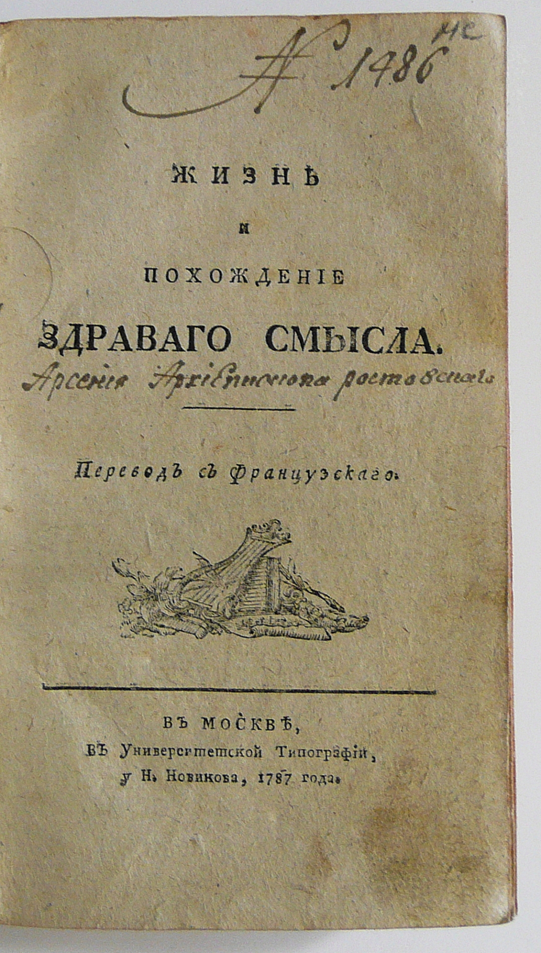 Жизнь и похождение Здраваго Смысла. / Перевод с французскаго. — Москва: В Университетской типографии у Н.Новикова, 1787. — [2], 1-208, 229-244, 225-241 с.; 8°