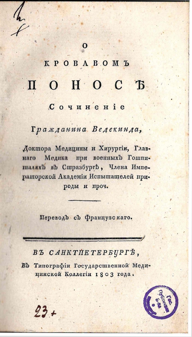 О кровавом поносе / сочинение гражданина Ведекинда, доктора медицины и хирургии, главнаго медика при военных гошпиталях в Стразбурге, члена Императорской Академии испытателей природы и проч.; Перевод с французскаго. — В Санктпетербурге: в типографии Государственной Медицинской коллегии, 1803. — [12], 120 с.; 8°