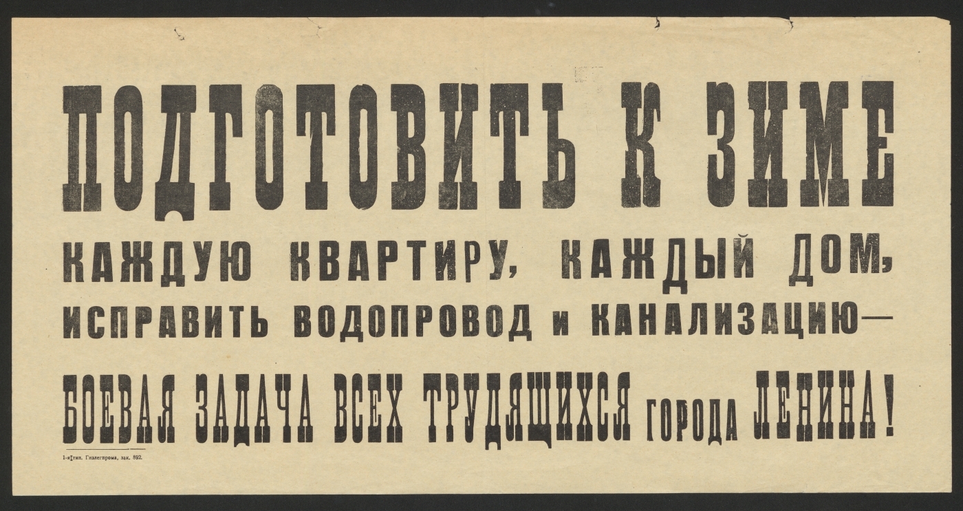 Подготовить к зиме каждую квартиру, каждый дом, исправить водопровод и канализацию - боевая задача всех трудящихся города Ленина!: [призыв]. — [Ленинград]: 1-я тип. Гизлегпрома, [1943]. — 1 л.; 27х54 см