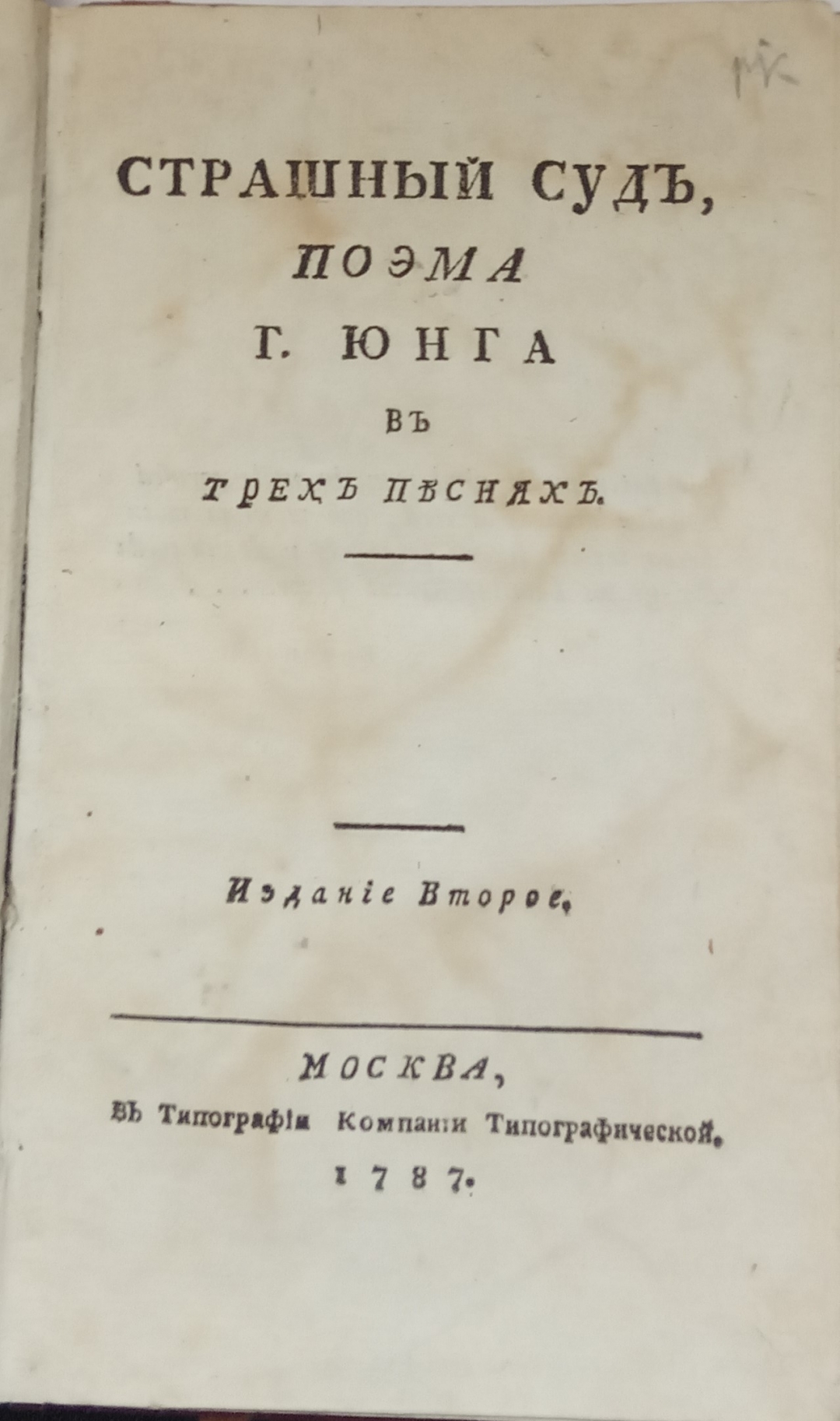 Страшный суд,: Поэма г. Юнга в трех песнях. — Москва: В типографии Компании типографической, 1787. — 49, [1] с.; 8° (19 см)