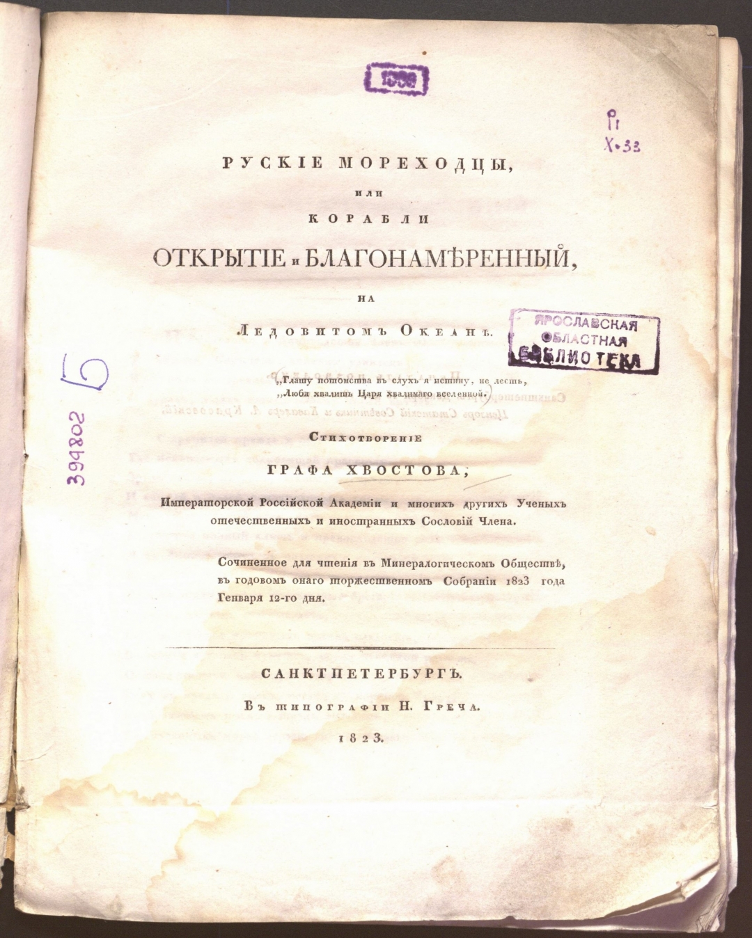 Руские мореходцы, или Корабли Открытие и Благонамеренный, на Ледовитом океане. / Стихотворение графа Хвостова, Императорской Российской академии и многих других ученых отечественных и иностранных сословий члена. Сочиненное для чтения в Минералогическом обществе, в годовом оного торжественном собрании 1823 года, генваря 12-го дня. — Санктпетербург: В типографии Н. Греча, 1823. — [2], 40, [2] с., [1] л. ил.: карты.; 4°(25 см)