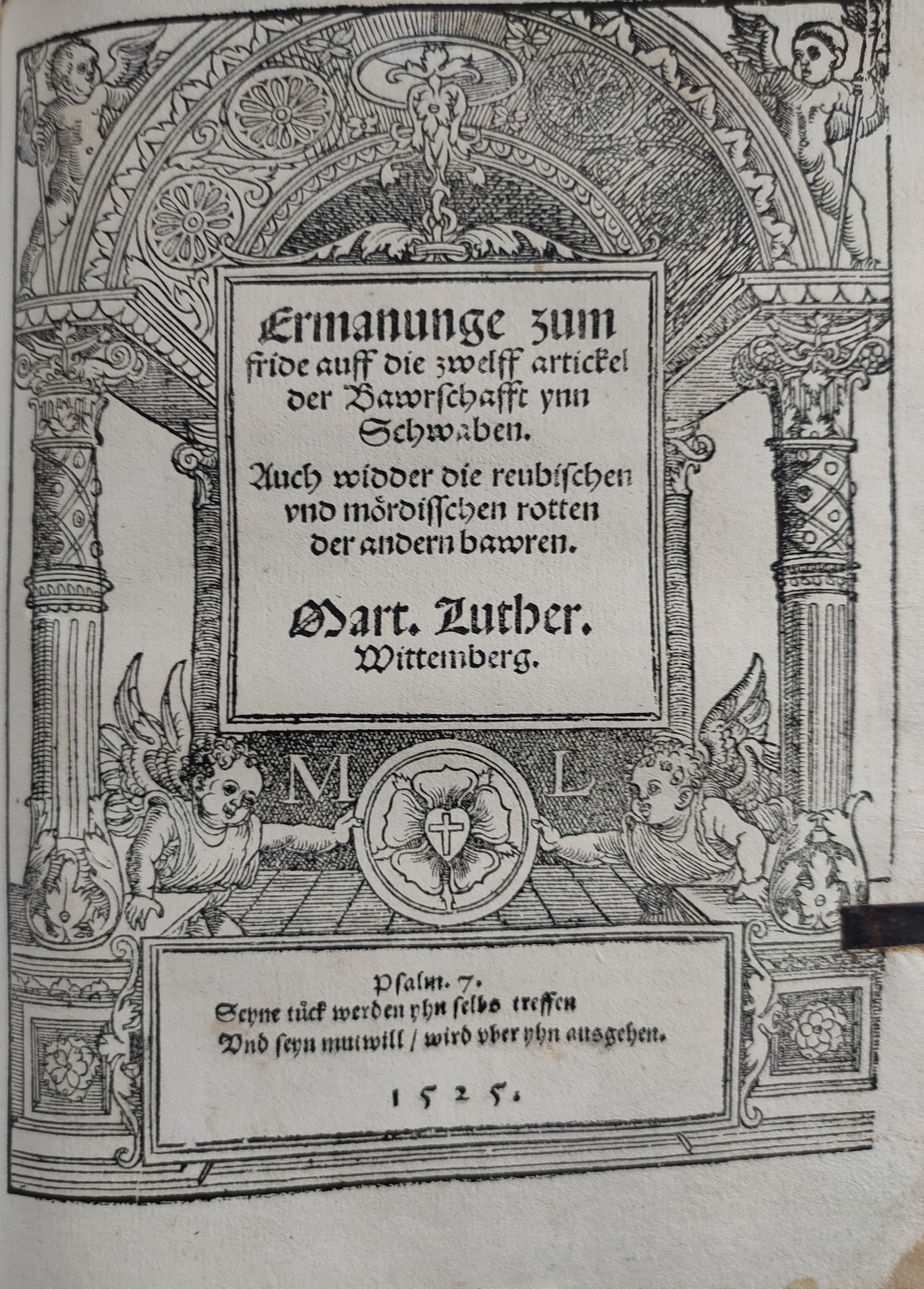 Ermanunge zum fride auff die zwelff artickel der Bawrschafft. Auch widder die reubischen und mördischen rotten der andern bawren / Mart. Luther. — Wittemberg: [Joseph Klug], 1525. — [24] л.: ил.; 4°