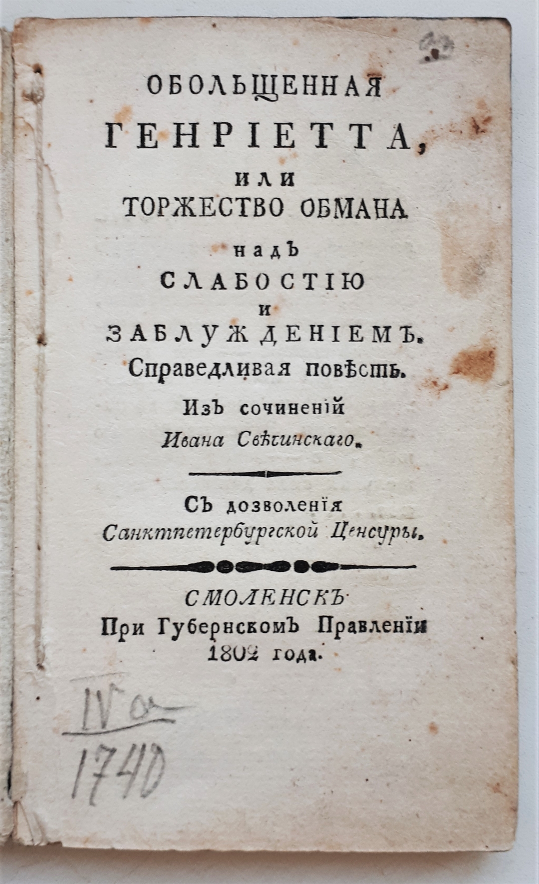 Обольщенная Генриетта, или Торжество обмана над слабостию и заблуждением: Справедливая повесть / Из сочинений Ивана Свечинскаго. — Смоленск: При Губернском Правлении, 1802. — 52 с.; 12°