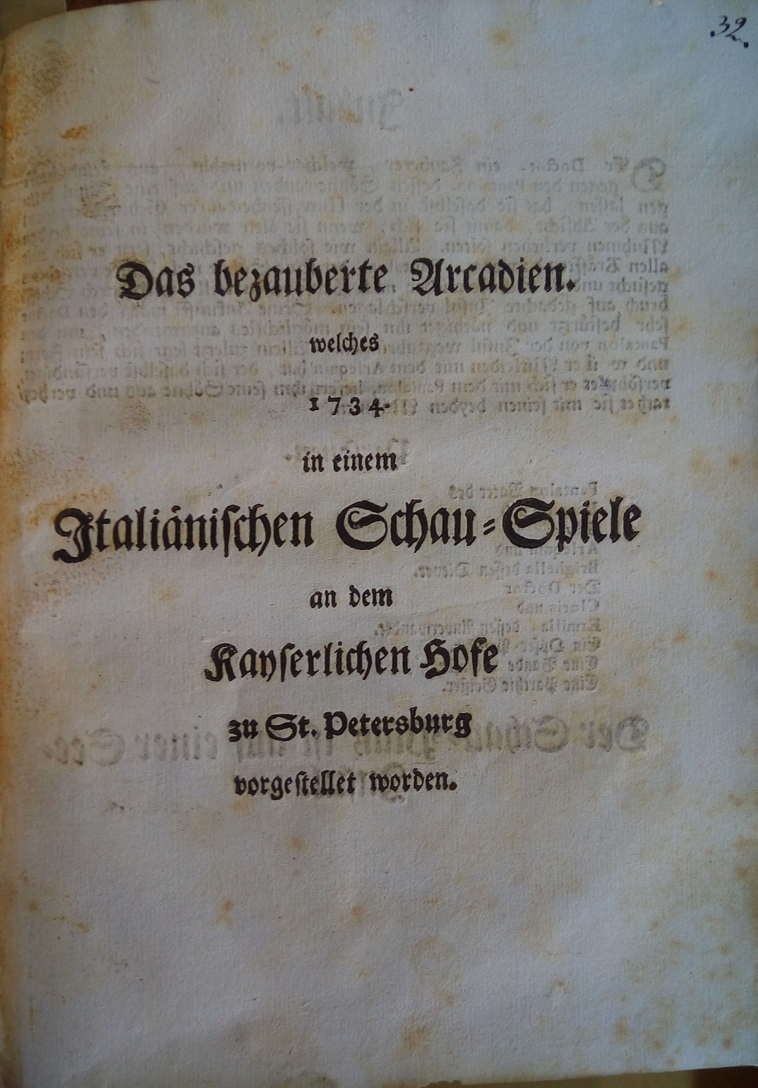 Das bezauberte Arcadien. welches 1734. in einem Italiänischen Schau-Spiele an dem Kayserlichen Hofe zu St. Petersburg vorgestellet worden. — [Санкт-Петербург]: [Типография Академии наук], [1734]. — 8 с.; 4⁰