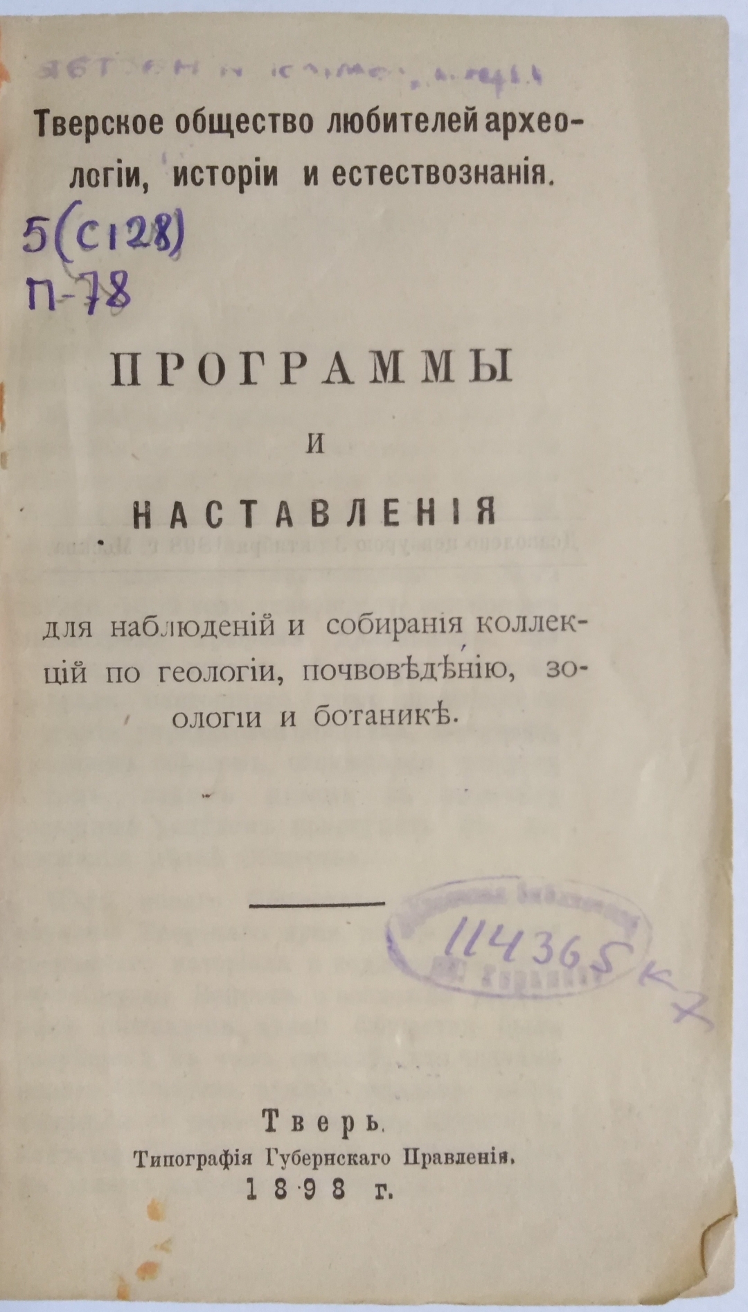 Программы и наставления для наблюдений и собирания коллекций по геологии, почвоведению, зоологии и ботанике / Тверское общество любителей археологии, истории и естествознания. — Тверь: Типография губернского правления, 1898. — [3], II-III, [2], 91, [1] с.; 16,8 х 10,6 х 0,4 см