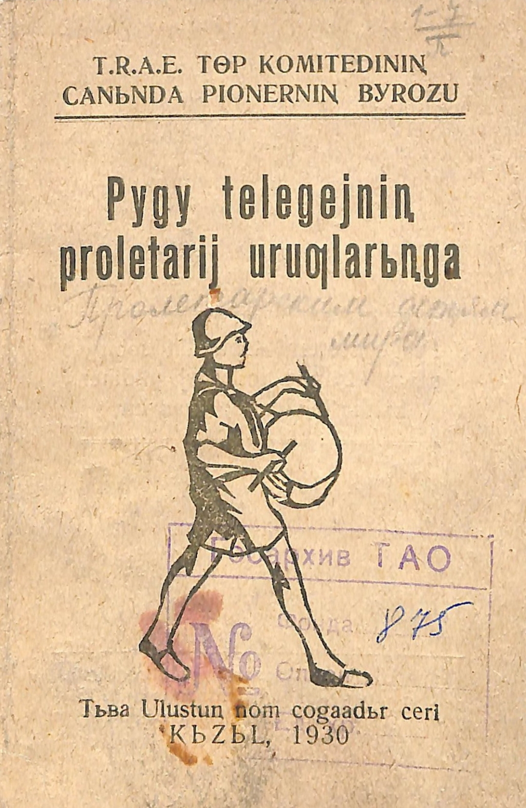 Pүgү telegejniŋ proletarij uruglarьnga / ТRAЕ Tөp komitediniŋ canьnda pionerniŋ вуrozu. — Kьzьl: Тьва ulustuŋ nom cogaadьr ceri, 1930. — 20 ar; 14х9х0,15