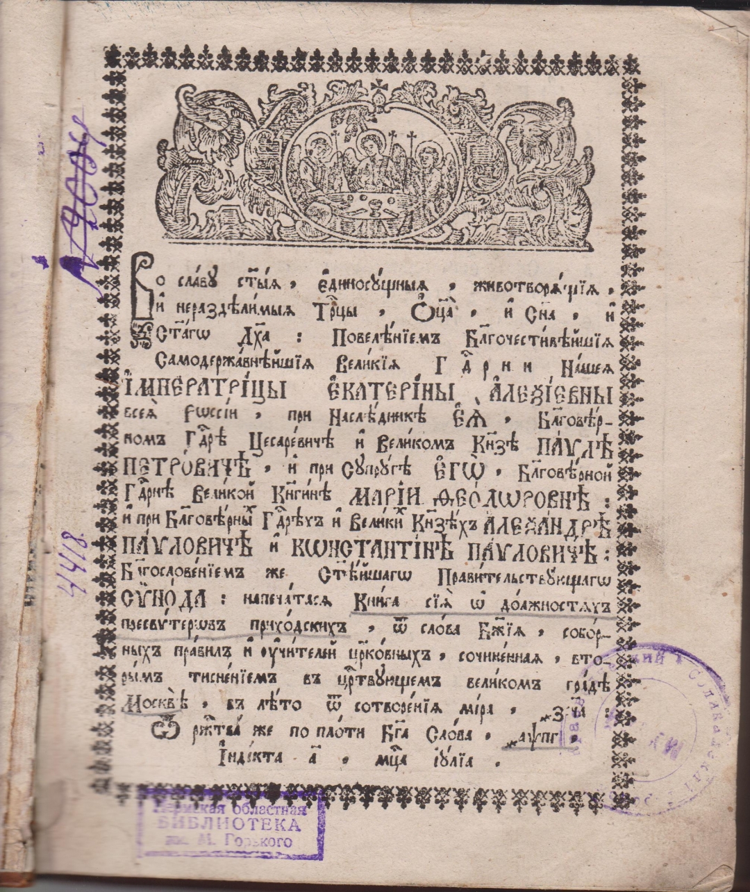 О должностях пресвитеров приходских. — Москва: Синодальная типография, 07.1783 (7291). — 1 тит., с. 6 нн., 1–288 = 296 с. = 148 л.; 4°