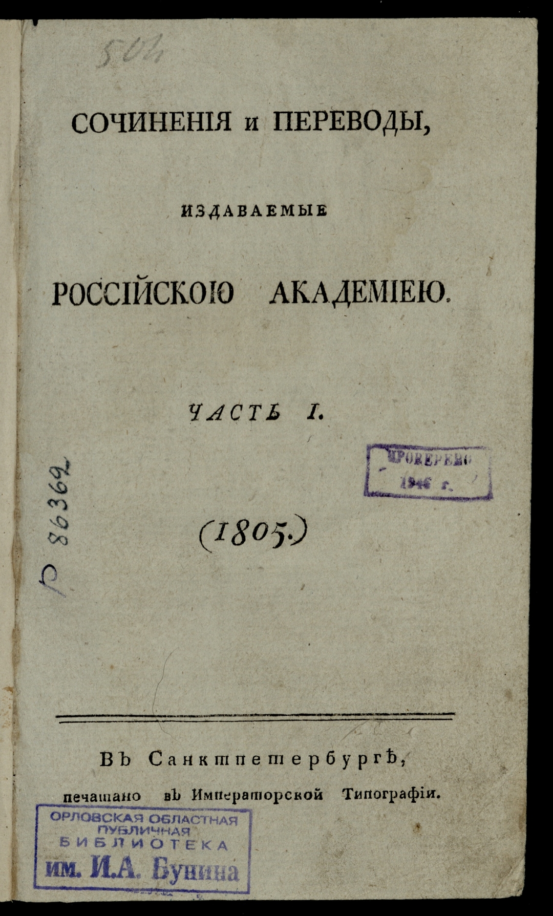Собрание образцовых руских сочинений и переводов в стихах / Изданное Обществом любителей отечественной словесности. [Ч.1–6]. — Санктпетербург : В Медицинской типографии, 1815–1817.