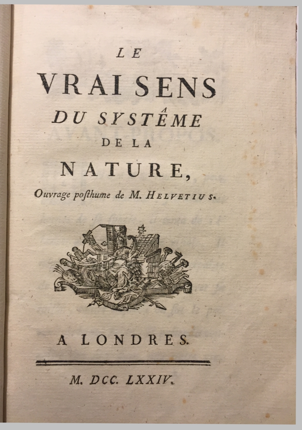 Le Vrai sens du Systême de la nature, / ouvrage posthume de M. Helvetius. — A Londres [London: s.n.], 1774. — [4], IIJ, [1], 151, [1] c.; 8°