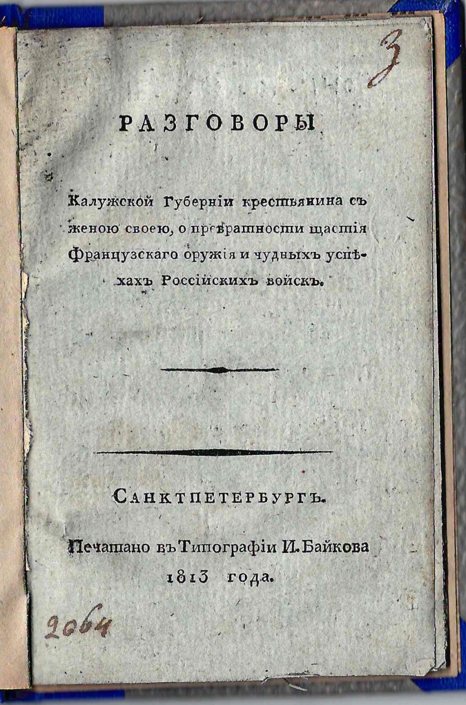 Разговоры Калужской губернии крестьянина с женою своею, о превратности щастия французскаго оружия и чудных успехах российских войск. — Санктпетербург: печатано в типографии И. Байкова, 1813. — 24 с.; 12°