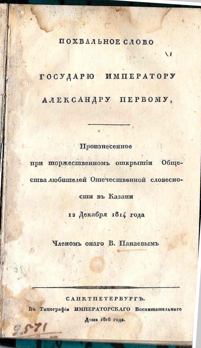 Похвальное слово государю императору Александру Первому, / произнесенное при торжественном открытии Общества любителей отечественной словесности в Казани 12 декабря 1814 года членом онаго В. Панаевым. — Санктпетербург: в типографии Императорскаго Воспитательнаго Дома, 1816. — [6], 41 с.; 8°