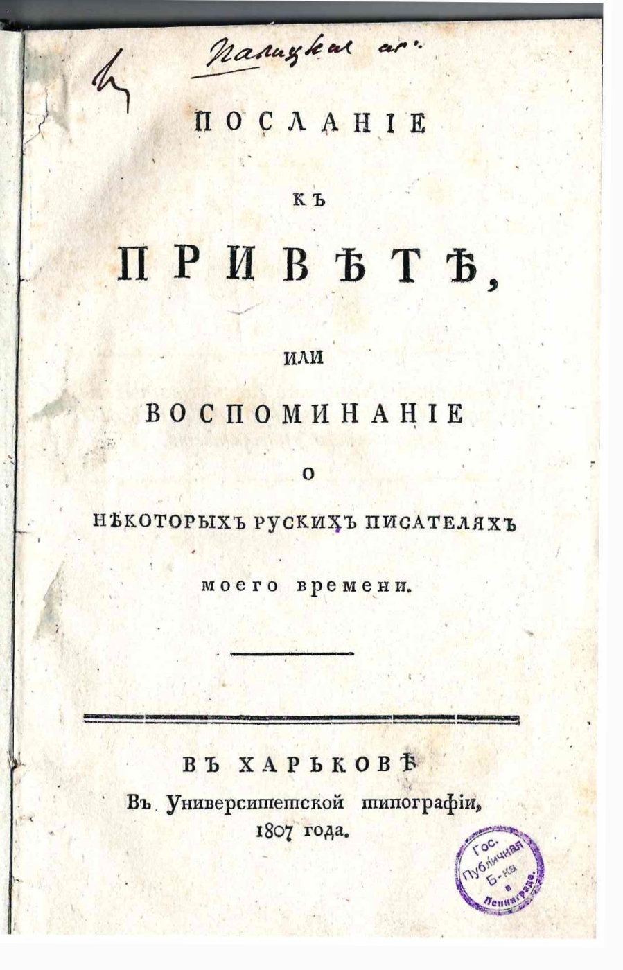 Послание к Привете, или Воспоминание о некоторых русских писателях моего времени. — В Харькове : в Университетской типографии, 1807. — 70 с.; 8°