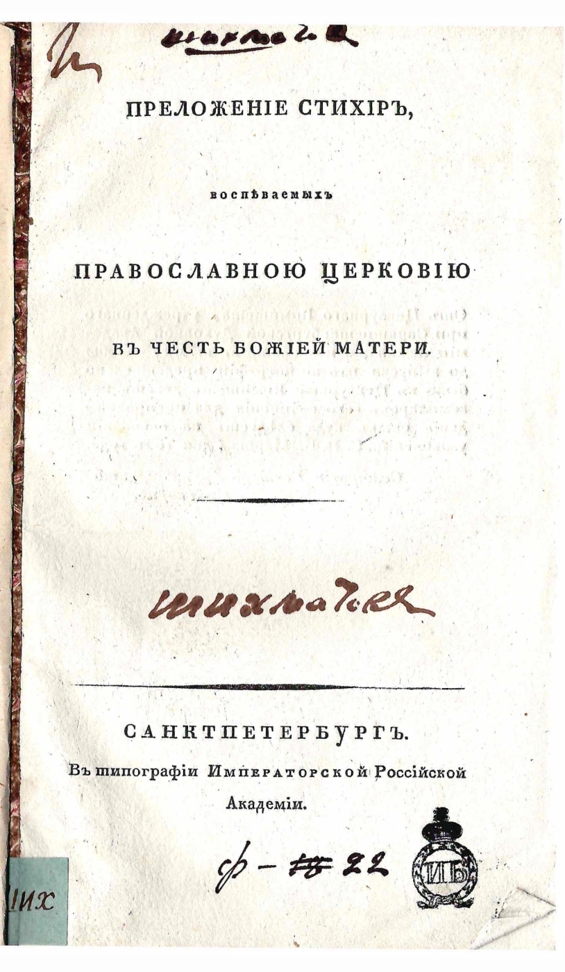 Преложение стихир, воспеваемых православною церковию в честь Божией Матери. — Санктпетербург: в типографии Императорской Российской академии, [1821]. — [2], 17, [1] с.; 8°