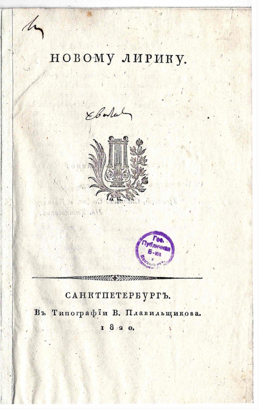 Новому лирику. — Санктпетербург: в типографии В. Плавильщикова, 1820. — 7, [1] с.; 8°