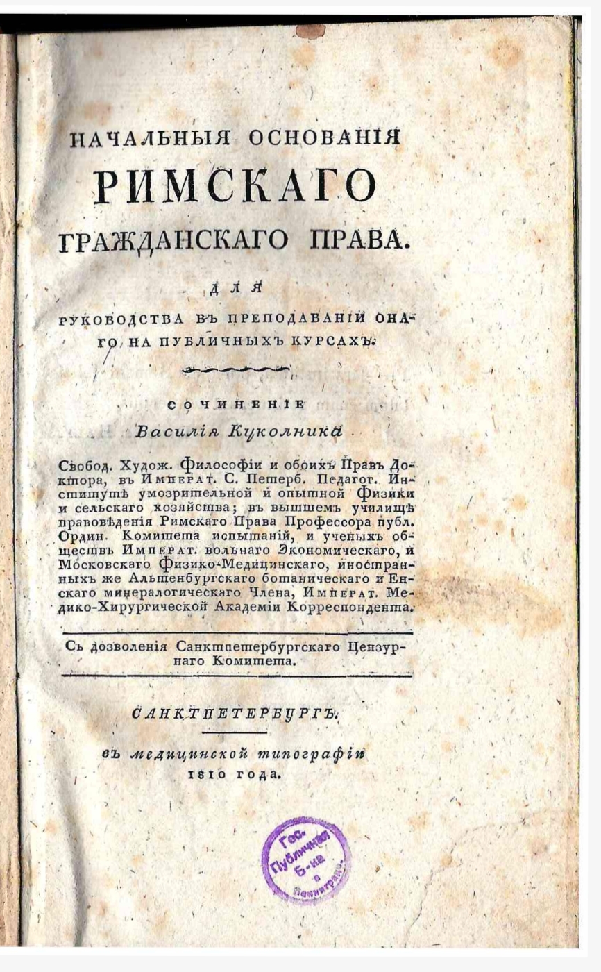 Начальныя основания римскаго гражданскаго права.: Для руководства в преподавании онаго на публичных курсах. / Сочинение Василия Куколника, свобод. худож. философии и обоих прав доктора, в Императ. С. Петерб. педагог. институте умозрительной и опытной физики и сельскаго хозяйства; в Вышшем училище правоведения римскаго права профессора публ. ордин. комитета испытаний, и ученых обществ Императ. Вольнаго экономическаго, и Московскаго физико-медицинскаго, иностранных же Альтенбургскаго ботаническаго и Енскаго минералогическаго члена, Императ. Медико-хирургической академии корреспондента. — Санктпетербург: в Медицинской типографии, 1810. — [2], X, 291, [1] с.; 8°