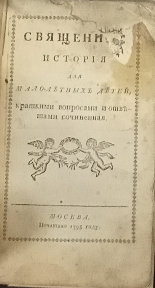 Священная история для малолетных детей: краткими вопросами и ответами сочиненная. — Москва: [Университетская типография, у Ридигера и Клаудия] , 1795. — 48 с. ; 8° (17 см)