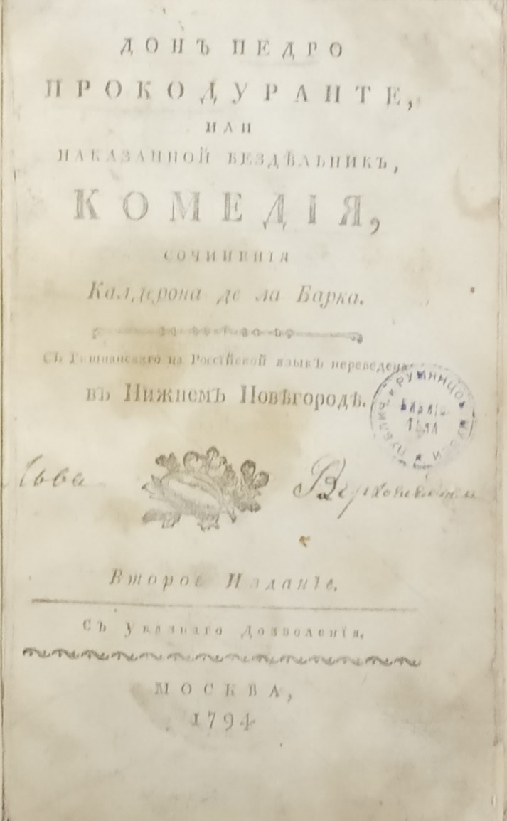 Дон Педро Прокодуранте, или Наказанной бездельник, : Комедия / Сочинения Калдерона де ла Барка; С гишпанскаго на российской язык переведена в Нижнем Новегороде. — Москва : [В Университетской типографии у Ридигера и Клаудия], 1794. — 126 с. ; 8°