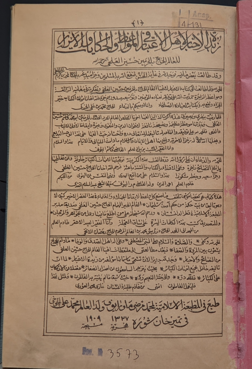 Анхар ал- ахзан / [пер. Сираджаддин, сын Хусейна ал-Убуди ал-Кумрави, Абу Мухаммад Касим из сел. Ашильта. Абу Мухаммад Касим из сел. Алак]. — Темир-Хан-Шура: Паровая типо-лит. М. Мавраева, 1909. — 56 с.; 27 х 18,5 х 0,8 см.