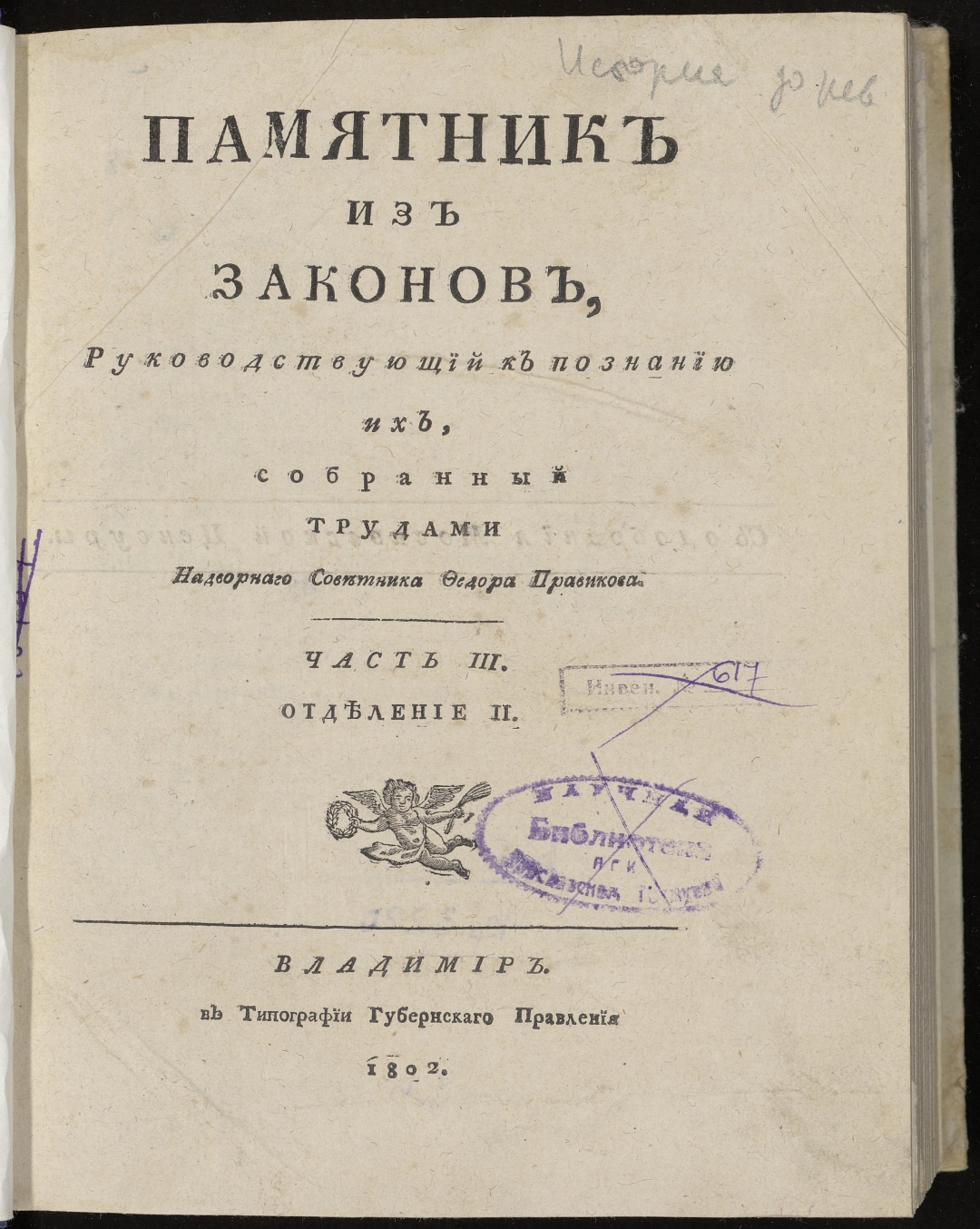 Памятник из законов... . — Владимир: В Типографии Губернскаго правления, 1802