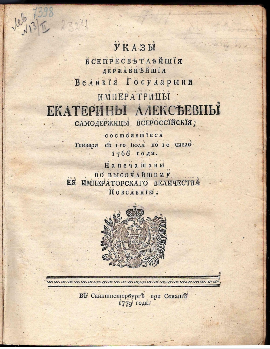 Указы всепресветлейшия державнейшия великия государыни императрицы Екатерины Алексеевны самодержицы всероссийския,: состоявшиеся генваря с 1 го июля по 1 е число 1766 года. / Напечатаны по высочайшему ея императорскаго величества повелению. — В Санктпетербурге: при Сенате, 1779. — [6], 379, [1] с.; 4°