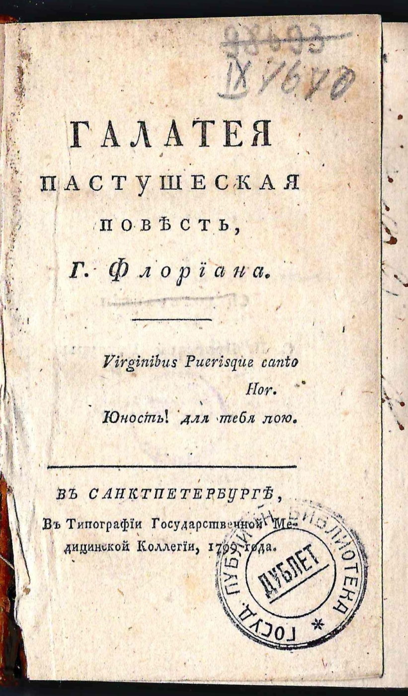Галатея : пастушеская повесть, / г. Флориана.; [Пер. с фр. яз. А.Ханенко]. — В Санктпетербурге: в типографии Государственной медицинской коллегии, 1799. — [4], 312 с.; 12°