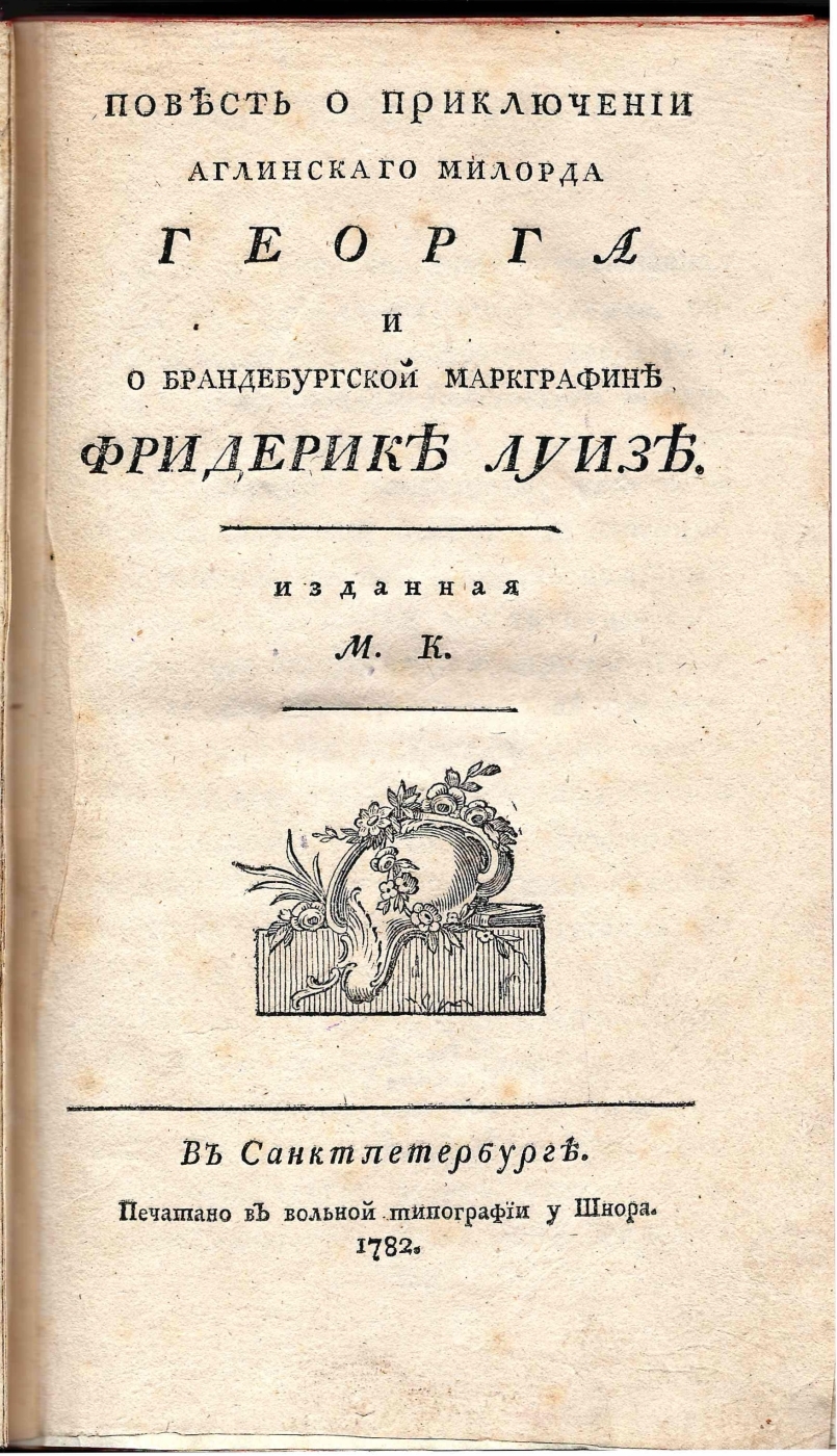 Повесть о приключении аглинскаго милорда Георга и о бранденбургской маркграфине Фридерике Луизе. — В Санктпетербурге: изданная М.[атвеем] К.[омаровым] : печатано в вольной типографии у Шнора, 1782. — [7], 1-144, 161-176, 161-215, 116-117, 218-239, [1] с.; 8°
