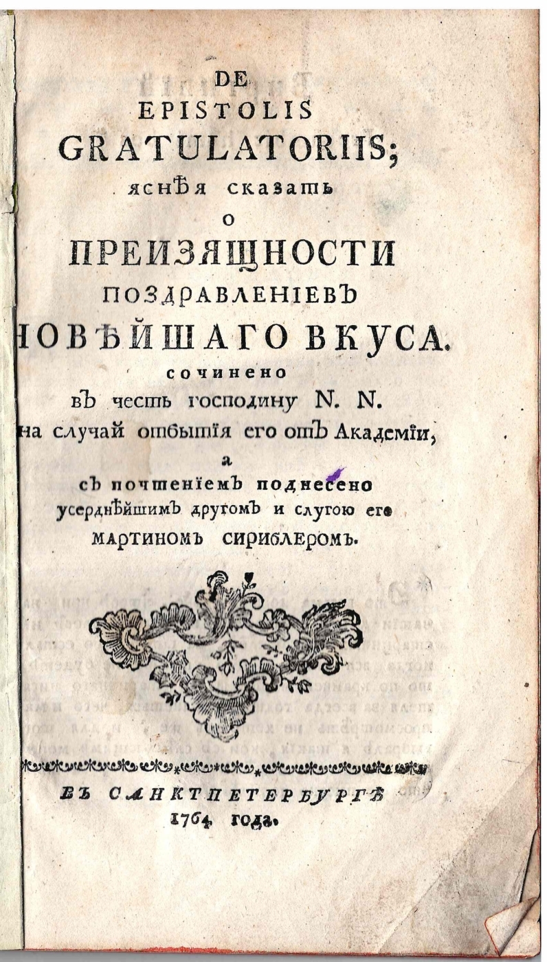 De epistolis gratulatoriis; яснея сказать О преизящности поздравлениев новейшаго вкуса.: Сочинено в честь господину N. N. на случай отбытия его от Академии, / а с почтением поднесено усерднейшим другом и слугою его Мартином Сириблером.; [Перевел Я. И. Трусов]. — В Санктпетербурге: [тип. Акад. наук], 1764. — 38 с.; 8°