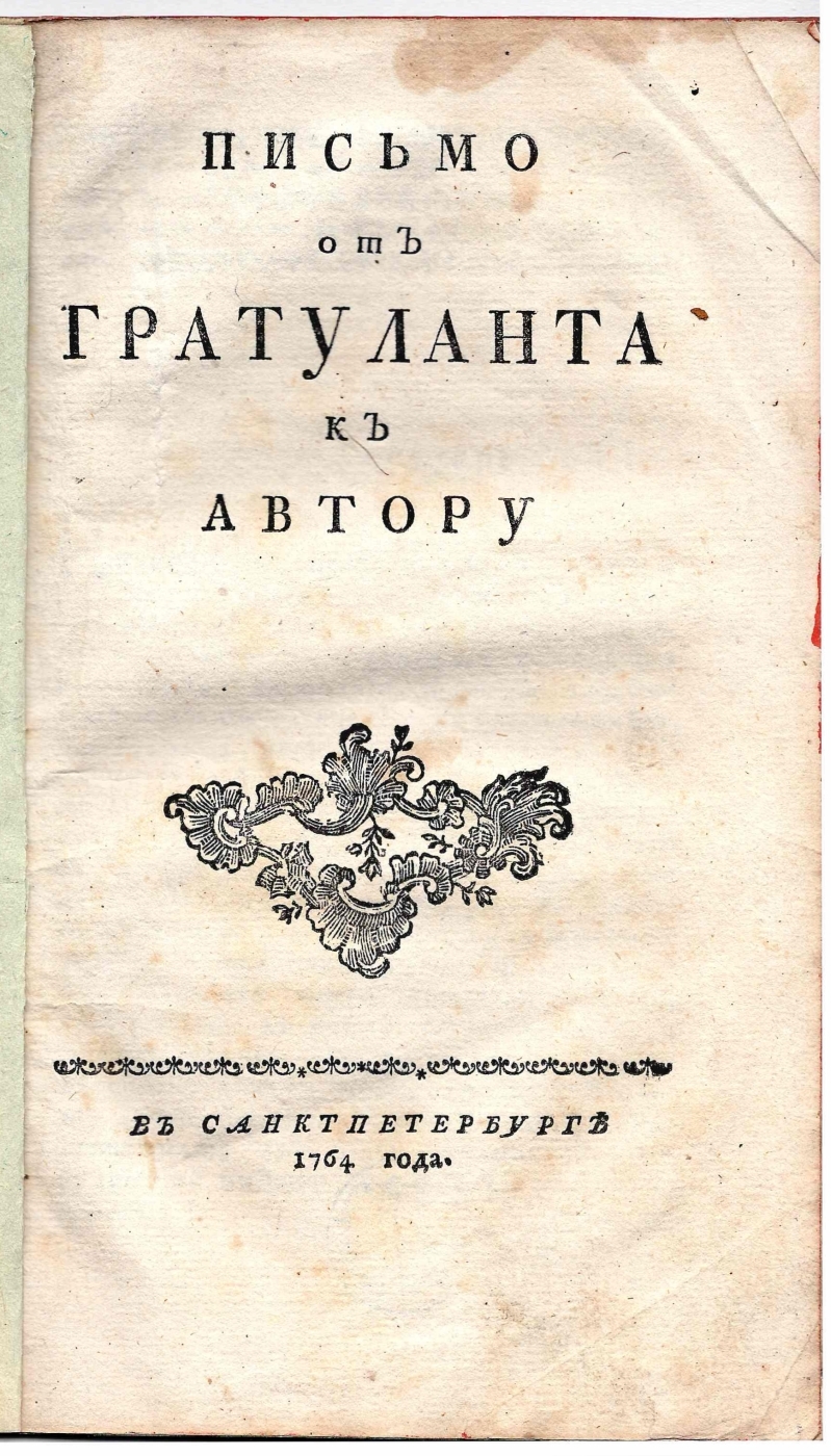 Письмо от гратуланта к автору / [перевел Я.И. Трусов]; 1764. — В Санктпетербурге: [типография Академии наук], 1764. — 19, [1] с.; 8°