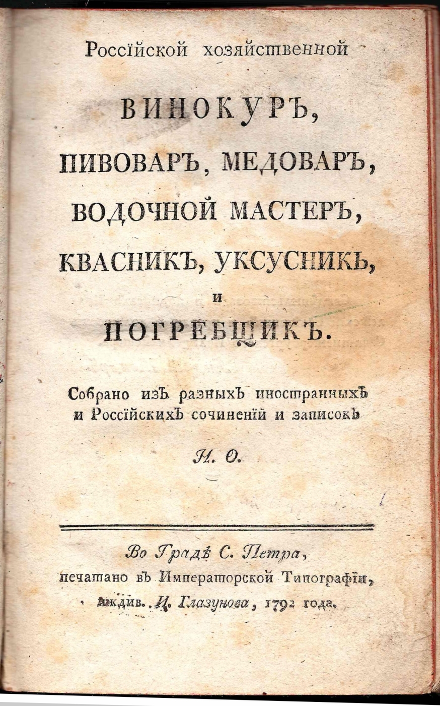 Российской хозяйственной винокур, пивовар, медовар, водочной мастер, квасник, уксусник, и погребщик. / Собрано из разных иностранных и российских сочинений и записок Н.О.. — Во граде С. Петра : иждив. И. Глазунова : печатано в Императорской типографии, 1792. — XII, 280 с.; 12°
