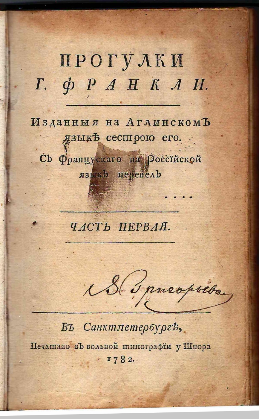 Прогулки г. Франкли. / Изданныя на аглинском языке сестрою его.; С францускаго на российской язык перевел .... [Ефим Рознотовский]. — В Санктпетербурге : печатано в вольной типографии у Шнора, 1782. — 304, [8] c.; 8°