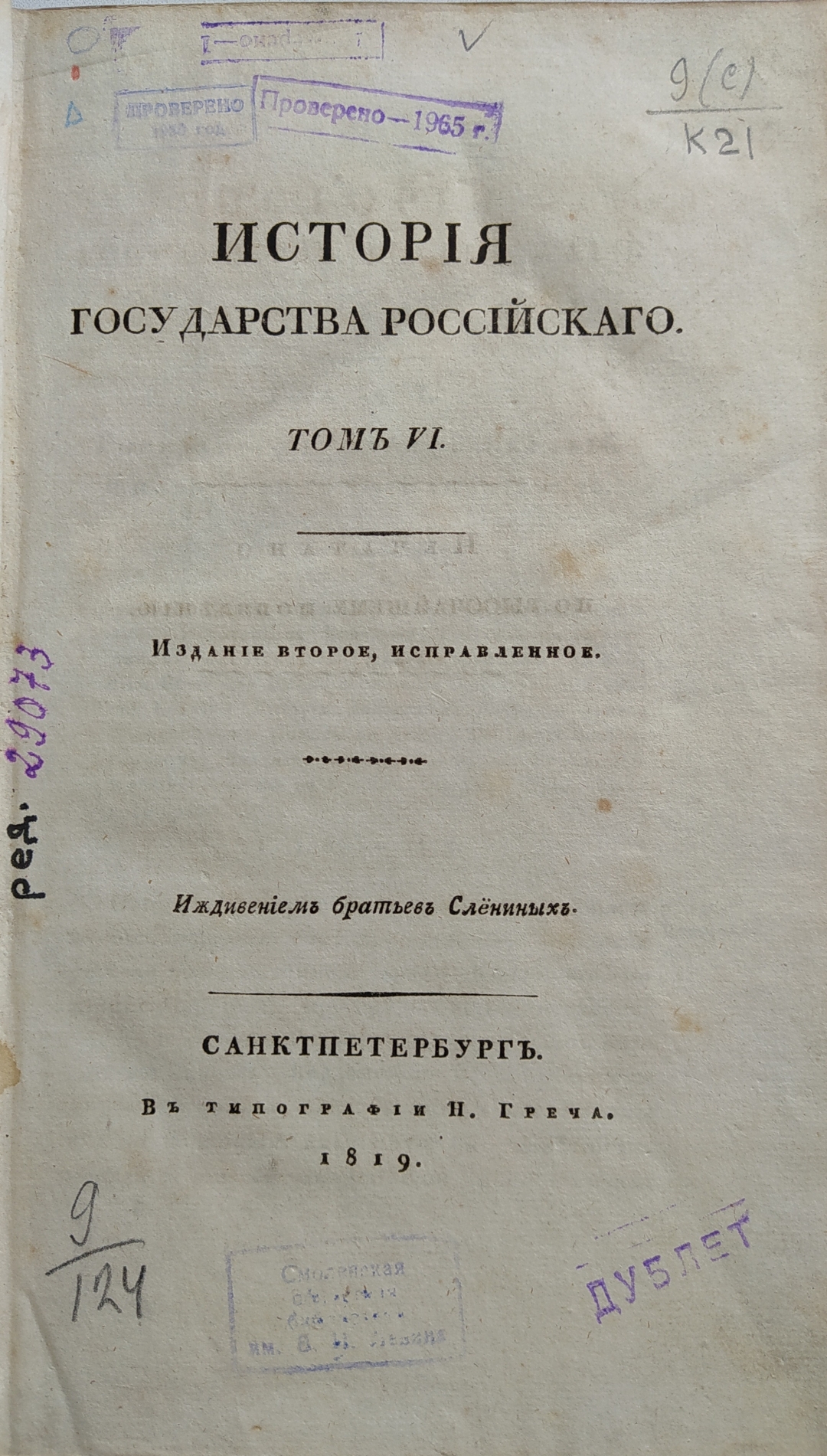 История Государства Российскаго.: [Т. 1 - 12]. — Санктпетербург : В типографии Н. Греча: Иждивением братьев Слениных, 1818 - 1829