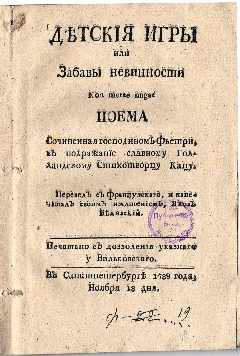 Детския игры или Забавы невинности: non merae nugae поема / сочиненная господином Фьетри, в подражание славному голландскому стихотворцу Кацу.; Перевел с французскаго, и напечатал своим иждивением, Яков Белявский. — В Санктпетербурге: печатано у Вильковскаго, 18 ноября 1789. — [2], 40 с.; 8°