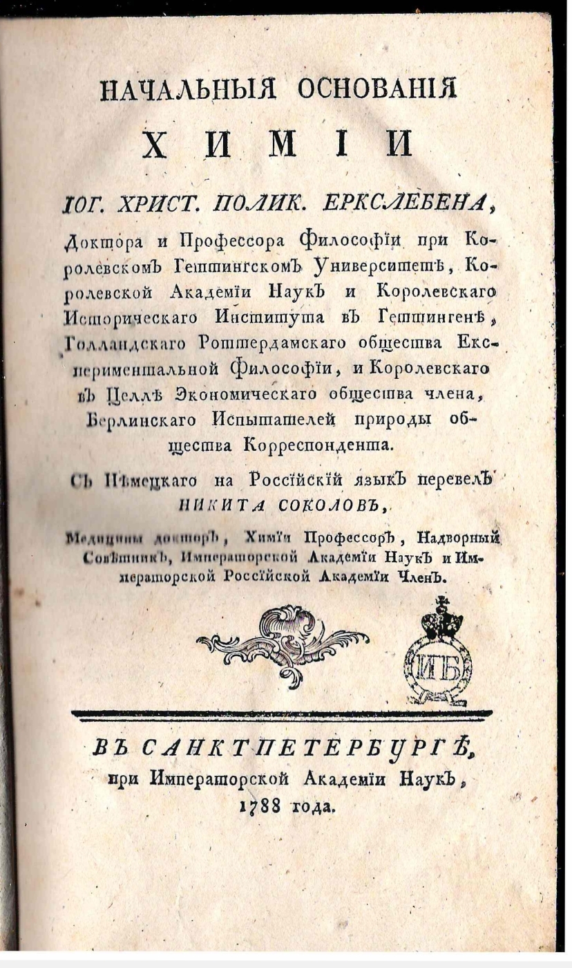 Начальныя основания химии / Иог. Христ. Полик. Еркслебена, доктора и профессора философии при Королевском Геттингском университете, Королевской академии наук и Королевскаго историческаго института в Геттингене, Голландскаго Роттердамскаго общества експериментальной философии, и Королевскаго в Целле Экономическаго общества члена, Берлинскаго испытателей природы общества корреспондента.; С немецкаго на российской язык перевел Никита Соколов, медицины доктор, химии профессор, надворный советник, Императорской Академии наук и Императорской Российской академии член. — В Санктпетербурге : при Императорской Академии наук, 1788. — [8], I-VIII, I-XV, XIV [=XVI], 418, [16] с. ; 8°